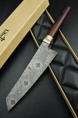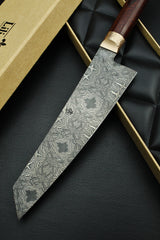 This Lilienstahl Gyuto is forged out of a superior damascus and finished with a snakewood handle.